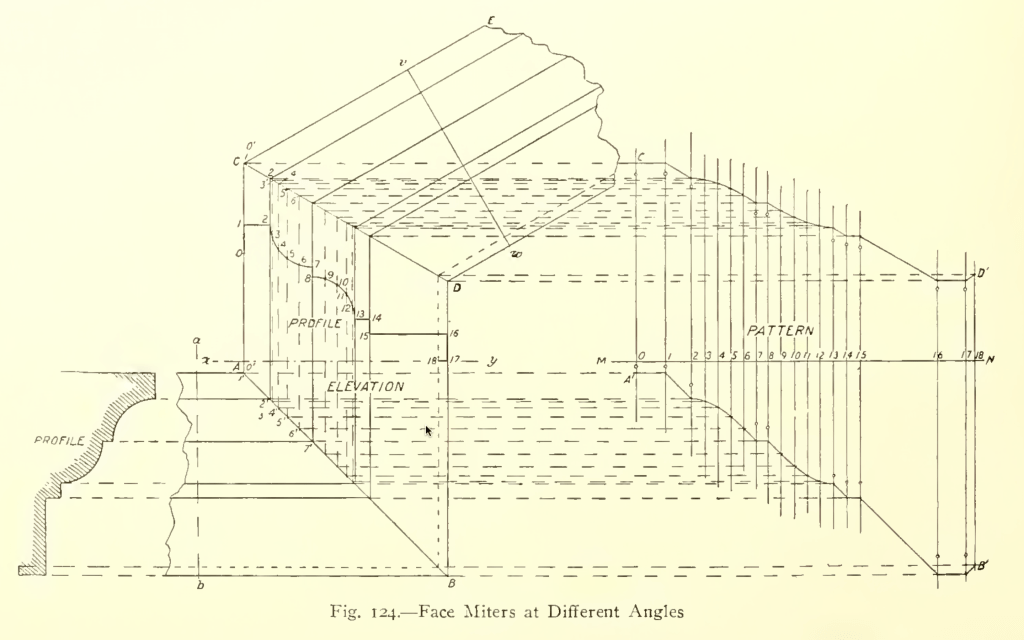 If any difficulty then arises, each point on the miter line can also be numbered to correspond with the point from which it was obtained on the profile, as indicated by 1′, 2′, 3′, etc., on either miter line.