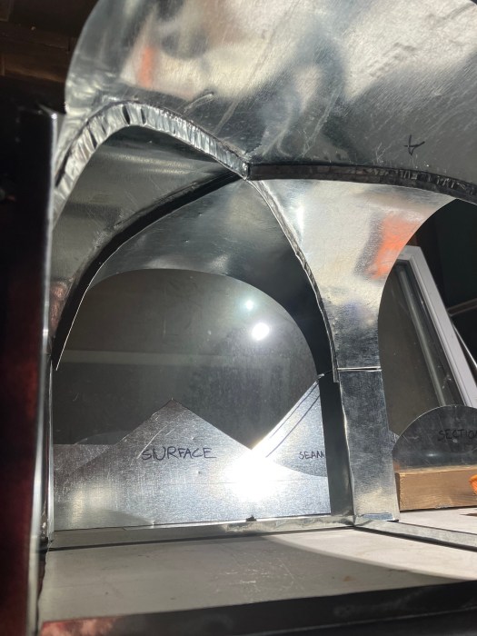 Let’s reiterate what this jumbled drawing proves…. In order to lay out the curve for a groin vault, you only needed to know the surface development of its inverse, the dome vault in square, and produce that net in the scribing floor. All cuts derived from tangents of that net line. This has been unfolded but I could have done it all within the original crossing section. There is no radius “off the sheet” required to produce the curve.