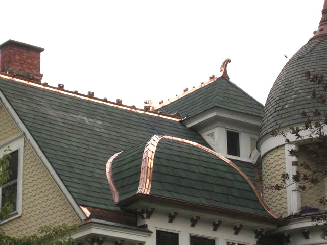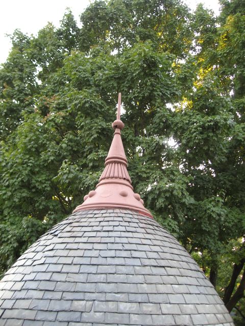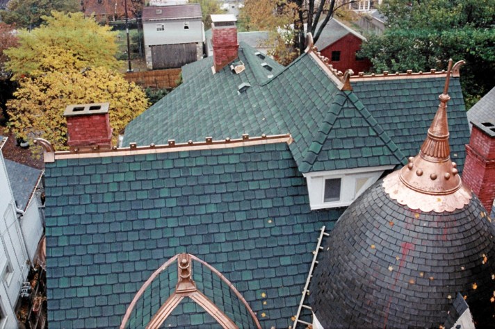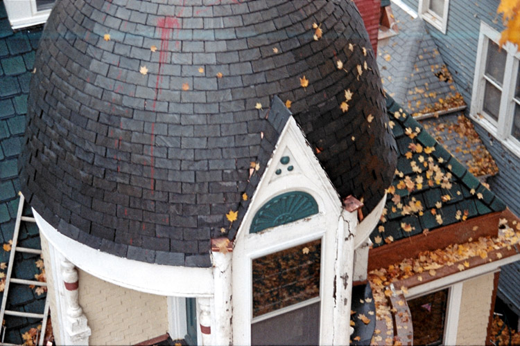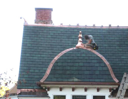 After completing the ridge cresting/finial project I got my first experience repairing slate roofing. This tower featured “peach bottom” slates that had been damaged by painters and misguided repairs over time.