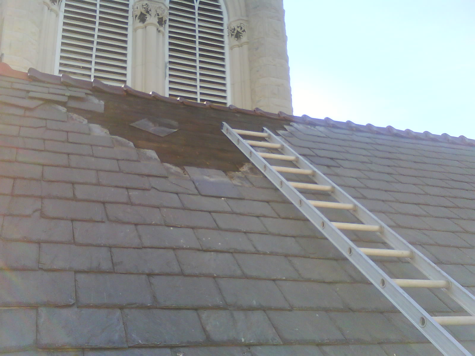 One of the great things about slate roofs, is their ability to be repaired, without throwing out the whole assembly. In 2008 Louisville was hit with a major wind storm which caused some gargoyles to fall off the secondary tower on St. Boniface Catholic Church.