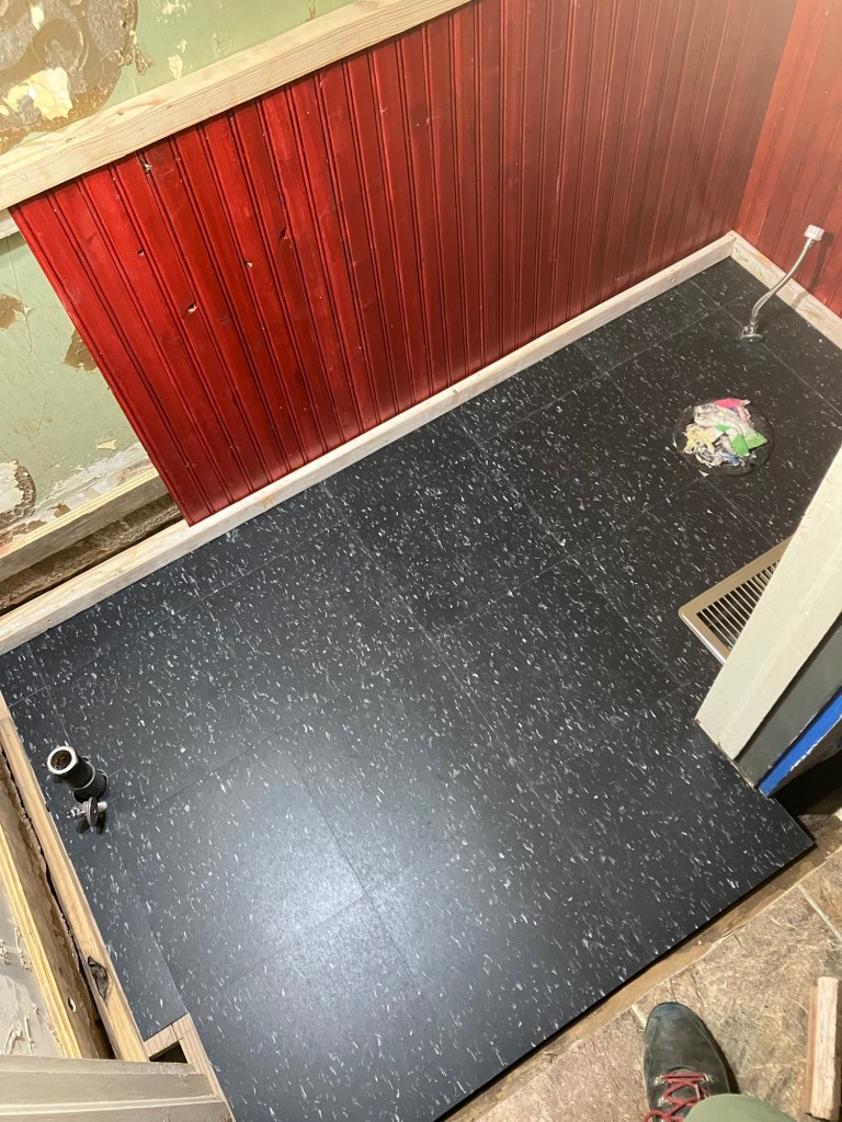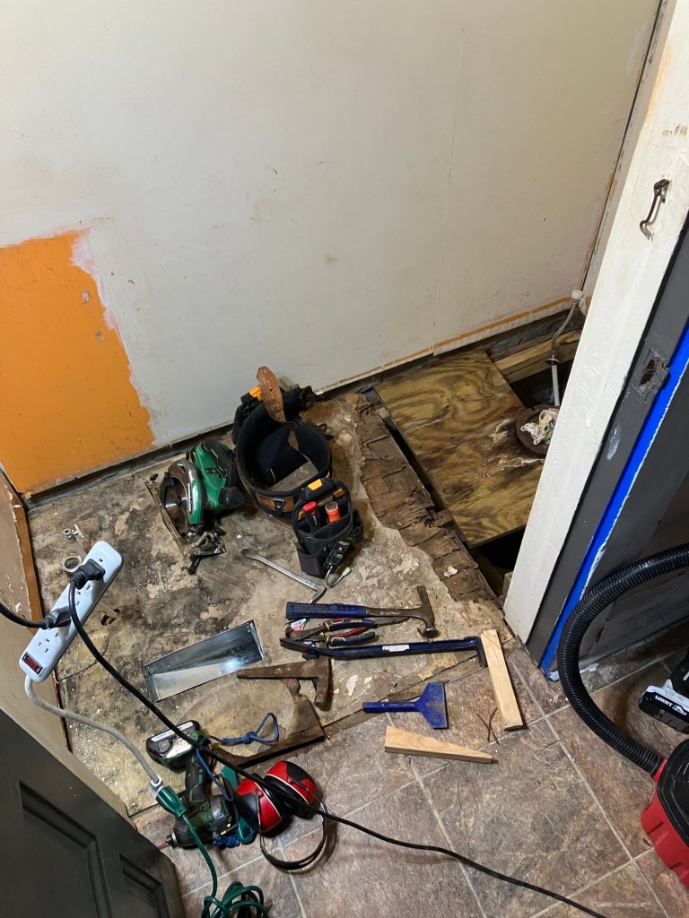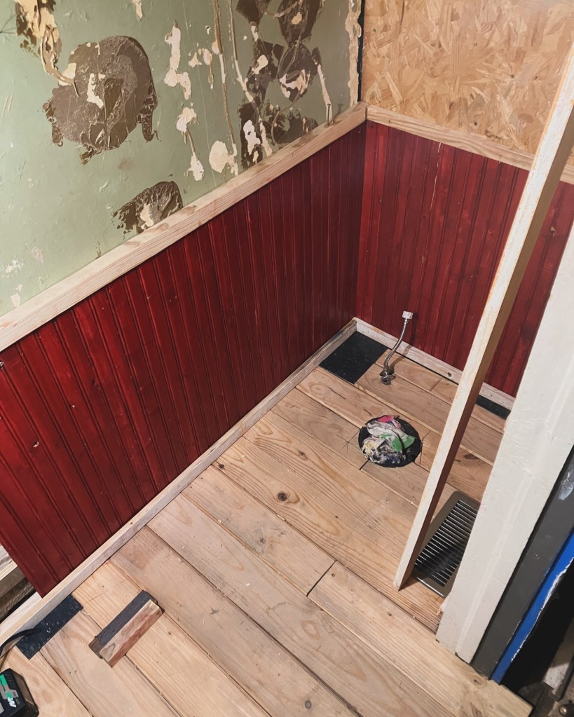 He learned how to remove a toilet without spilling water everywhere, dismantled multiple layers of flooring and patches. We made one trip to the big box store for fixtures and finishes, and one trip to the lumber yard for framing and flooring lumber.