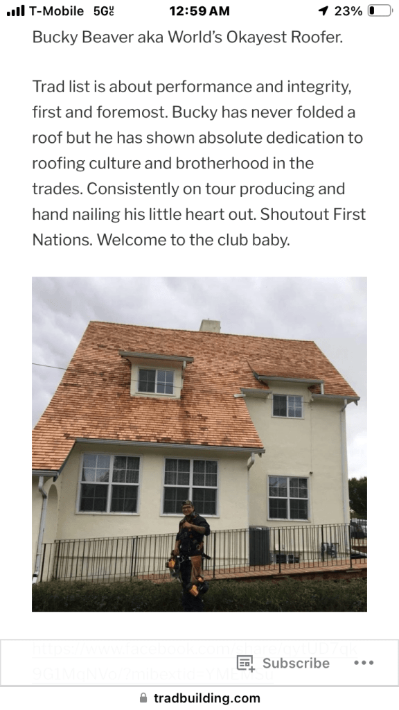 Trad list is open and active if you advertise your work and we see it, you may be considered for jury simple as. the wave we started at tradroofing in North America in 2012 has grown. here’s a little guy Brendan worked on for 11 hours. Quite the task model.